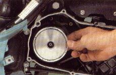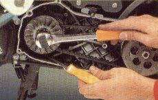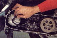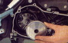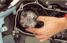 Ya tenéis todo a mano. Ahora debéis quitar la tuerca que fija el variador al eje del cigüeñal. Como éste gira, hay que inmovilizarlo con una herramienta especial ( llamada estrangulador ), que si no disponéis de ella, podéis reemplazar con un destornillador, mordaza... |