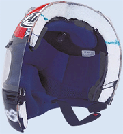 Ya habíamos mencionado anteriormente los materiales utilizados actualmente, pero para que sean eficaces, deben de tener un determinado espesor dependiendo del material utilizado y que podria ser de: 3,5-4 mm para el policarbonato y el A.B.S y de 3-3,5 mm para la vitroresina. El proceso de fabricación son dos: el estampado de vitrorresina y el inyectado de resinas termoplásticas. El método utilizado en el primer caso es el moldeado por contacto a mano, permite la utilización de moldes de bajo coste y permite la máxima flexibilidad del proyecto haciendo posible todo tipo de variaciones. Como norma general se utiliza un molde del tipo hembra, de chapa o de vitroresina obtenido a partir de un molde de yeso o de madera. La superficie de contacto debe de ser tratada con un material anti-pegamento, se coloca una capa de resina (puede ser coloreada) un poco espesa y se colocan los materiales de refuerzo en el molde capa sobre capa . cada estrato es impregnado con resina catalizada y acelerada. La aplicación de la resina se hace con pincel y se debe de hacer lo mas compacto posible distribuyendo uniformemente la resina y teniendo cuidado de eliminar las burbujas de aire que se puedan formar. El endurecido se puede hacer al aire o al horno, esto influye en el tiempo de secado no en la dureza. Este proceso se ve ilustrado en la secuencia de imágenes de la izquierda y el proceso es idéntico para la confección de cualquier pieza de vitroresina. En el caso de la estampación por inyección de resinas termoplásticas, el molde es mas complejo, ya que esta formado por dos partes la interna y la externa quedando el espesor exacto. En este proceso, el material esta en forma de gránulos y se hecha a una maquina la cual procede a plastificar los granos por fusión y la inyecta en el molde cuando esta en la temperatura adecuada. Hay que tener cuidado al elegir el punto de inyección ya que en esa zona el casco queda debilitado, por eso se suele elegir en la parte posterior siendo uno de los puntos a mirar a la hora de elegir un casco. Aerodinámica Es sabido que el movimiento de un cuerpo sólido con respecto a un fluido genera fuerzas ,derivando el problema de la aerodinámica, teniendo que resolver dos problemas: 1.- La reducción de la resistencia que opone al avance 2.- Procurar el aprovechamiento aerodinámico para evitar que el casco se salga de la cabeza, que circule cierta cantidad de aire por el interior para mejorar la capacidad auditiva, que no se empañe... Para la confección de un casco, se realiza primero un diseño del mismo y posteriormente se confecciona lo que va a ser la plantilla del molde del casco y se somete a una prueba en el túnel de viento, siguiendo las mismas técnicas que las empleadas para los diseños aerodinámicos de los carenados y carrocerías, colocando los hilos y viendo hacia donde se dirigen con la fuerza del viento, haciendo las modificaciones que se estimen oportunas hasta obtener el resultado deseado Con las pruebas del túnel de viento conseguimos que un casco sea practico de llevar, para eso, debe de tener una arquitectura simple y eficaz. Cualquiera esta en condiciones de darse cuenta de cuales son las cualidades que debe de tener un casco y estas cualidades son las siguientes: 1.- Yendo a una cierta velocidad el casco no tiende a salirse de la cabeza tirando hacia atrás de la misma y teniendo que hacer un excesivo esfuerzo con el cuello. 2.- Facilita el movimiento lateral de la cabeza 3.- Tiene una buena visión frontal y sobre todo lateral favoreciendo que no se tenga que girar en exceso la cabeza 4.- No llena los ojos de lagrimas 5.- No producen ruidos y remolinos de aire en el interior. 6.- No se empaña con facilidad. 7.- La lluvia se escurre bien y va a parar a donde debe. 8.-Terminación y acabado optimo, sobre todo en el interior que deben de ser con materiales anti-alérgicos y suaves para no provocar irritaciones Seguridad y Homologación Estadísticas elaborados en los últimos años, han demostrado que el 40% de los fallecimientos de motoristas en accidente se hubiera evitado si se llevara el casco o si este fuera el adecuado. Un buen casco debe absorber las ondas se choque que se descargan en el interior de cráneo en el momento del impacto y en instantes inmediatamente posteriores amortiguando la acción fatal que dichas ondas ejercen en la masa encefálica. También como medida de seguridad la parte exterior se debe de tener en cuenta y es preferible que el casco sea de color blanco, amarillo o naranja y además que contenga tanto en su parte anterior como en la posterior y los laterales algún material fluorescente y retrorreflectante. Los cascos homologados deben de superar unas pruebas ya que su resistencia no debe de ser alterado por las condiciones atmosféricas para que no se deformen con el frío y el calor, por eso se someten a temperaturas entre 50º y -20º. Además los cascos están sometidos a unas pruebas de resistencia a los golpes longitudinales y transversales. En estas pruebas, el casco es colocado sobre una cabeza falsa de medidas adecuadas y recibe un peso en caída libre desde una determinada altura. La capacidad de absorción de los golpes se consigue midiendo la fuerza trasmitida a la falsa cabeza que esta conectada a un dinamómetro. En las pruebas de resistencia a la penetración, el casco es golpeado con un punzón metálico en forma cónica con una determinada fuerza y la punta del punzón no debe de acercarse a la cabeza falsa por encima de un valor determinado. Existen además otras pruebas como por ejemplo la resistencia al deterioro de los materiales fluorescentes y retrorreflectantes.