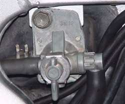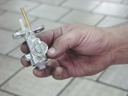 Tanque de Combustible y Llave de Paso. Cualquiera que sea el tipo de carburador, utilizado, debe ser abastecido con gasolina y esta es almacenada en el tanque de combustible de la motocicleta. El cual esta provisto de una tapa y una llave de paso de combustible. La tapa del tanque esta provista a su vez de un orificio de ventilación, el cual es esencial porque, si el aire no puede fluir dentro del tanque, la gasolina no saldría. Llave de Paso - Cuando la llave esta en posición "ON" (normal) el conducto principal se abre y fluye la gasolina a la cuba del carburador. - Se coloca en la posición "RES" cuando el nivel de combustible en el tanque es demasiado bajo. - Cuando esta en la posición "OFF", ambos conductos quedan cerrados, Generalmente la gasolina contiene agua y otra impurezas. Por esta razón, la llave de paso posee un filtro para contener las impurezas y una taza donde se depositan. Existe otro tipo de llave de paso que se cierra automáticamente cuando el motor se detiene (LLAVES NEGATIVAS), esta es operada por depresión (presión negativa). Llave de Paso Automatica Cuando la presión es negativa (vacío), el diafragma (4) se mueve hacia la izquierda, hacia el lado del motor comprimiendo el resorte (1), tirando de la válvula (2) para que estese abra, permitiendo que la gasolina fluya. Cuando la presión es positiva, el resorte (1) forza, el eje de la válvula (2) fuertemente contra el orificio de entrada evitando así que la gasolina inunde el carburador. La motocicleta FZ50 se encuentra equipada con una llave de paso de este tipo. Esta llave tiene tres (3) posiciones: ON, RES; y PRI.