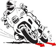 Figura 4.9: La asimetría de la carga sobre el neumático, y la retención que realiza el freno sobre la rueda, provocan un giro del manillar en el sentido del giro, lo que en realidad representa un contramanillar que levanta la moto de la tumbada. Cuando se acciona el freno trasero, la moto baja de atrás, la rueda se pega más al asfalto, y el tren anterior no sufre tanta sobrecarga. Esto, unido a la retención asimétrica que el freno ejerce sobre el neumático y a la geometría del chasis, facilita que la moto cierre más la trazada y, por consiguiente, se la pueda meter más en la curva. Pero una presión inapropiada sobre la palanca, también puede descompensar la adherencia del neumático trasero al asfalto y hacer que derrape.Por tanto y resumiendo, los efectos de ambos frenos, divergen en las curvas: 1. El freno delantero tiende a que la moto se levantey pierda trazada. Estas diferencias, hay que tenerlas en cuenta, según la circunstancia. RECOMENDACIONES PARA FRENAR ENTUMBADA 1. Realizar la frenada con mucho tacto y reducida almínimo imprescindible. 2. Emplear solo el freno trasero 3. Emplear los dos frenos manteniendo la tumbada. 4. Emplear con contundencia los frenos perdiendo Ensayar la frenada. Es importante que el motorista se haga una idea de la capacidad de la frenada de su moto. Una buena manera de saber esto es haciendo pruebas, con prudencia, en una recta de un sitio solitario. Se ponen unas marcas en el sitio de inicio de frenada y en donde se quiera parar la máquina. Luego se va probando a distintas velocidades, accionando los frenos de manera independiente y conjunta. Se va apurando cada vez más, para ver respuestas. Hay que procurar siempre, en estas pruebas, que la moto no pierda su verticalidad, ya que una derrapada con la moto tumbada es muy peligrosa. EL PASAJERO EN LA FRENADA. Cuando llevamos pasajero/a, notaremos todas las inercias de su masa corporal sobre la moto. Necesitaremos mas tiempo y mas potencia de frenada, por lo que debemos incluirlo en la programación de la maniobra.El pasajero debe de implicarse en el pilotaje y estar siempre atento a los eventos que suceden. Tanto en la frenada, como en la aceleración, debe de anticiparse en la corrección de esas inercias, para no echarse encima del piloto o descolgarse hacia atrás. La presión de los muslos sobre la moto o las caderas del conductor, junto con el agarre a su cintura, o el apoyo de sus manos sobre el depósito de gasolina (en caso de motos deportivas), le proporcionarán el punto de apoyo al tronco para los movimientos de compensación FRENAR EN EL PILOTAJE DEPORTIVO. Los mismos principios expuestos para la conducción por carretera, son válidos para el pilotaje de competición en un circuito, aunque con algunas diferencias radicales derivadas del desarrollo tecnológico, incluido la electrónica. Por un lado, la rueda trasera es esencial para la estabilidad de la tumbada y con el freno trasero es fácil cometer errores en las circunstancias extremas de la competición, sobre todo porque en el pie no se tiene la exquisita sensibilidad de la mano. Por otro, el freno delantero está hoy día desarrollado para cubrir las necesidades de la frenada2 y el quitar una variable insegura de la maniobra –freno trasero‐ beneficia la concentración en