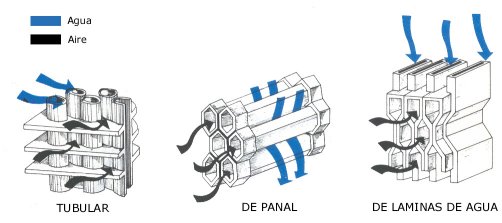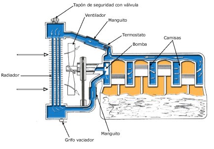 Una polea accionada accionada por el cigüeñal hace funcionar el ventilador que lleva a pasar el aire por el radiador.El radiador es un depósito compuesto por láminas por donde circula el agua. Tiene un tapón por donde se rellena y dos comunicaciones con el bloque, una para mandarle agua y otra para recibirla.Hay varios tipos de radiador, los mas comunes, son (Fig. 3):Tubulares.