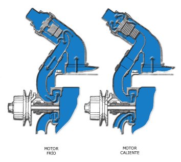 En los sistemas por bomba y por circuio sellado, llamado también de circulación forzada, la corriente de agua es accionada por una bomba de paletas que se encuentra en el mismo eje que el ventilador.En tiempo frío, desde que se arranca el motor hasta que alcance la temperatura ideal de los 75º ó 90º, conviene que no circule agua fría del radidor al bloque, por lo que se intercala, a la salida del bloque, un elemento llamad termostato y que, mientras el agua no alcance la temperatura adecuada para el motor, no permita su circulación.Para evitar que en tiempo devasiado frío se congele el agua del circuito, se suelen utilizar otros líqudos, que soportan bajas temperaturas sin solidificarse, denominados anticogelantes.El termostato está formado por un material muy sensible al calor y consiste en una espiral bimetálica (Fig. 4) o un acordeón de metal muy fino onduladoy que ebido a la temperatura del agua abre o cierra una válvula, regulando así la circualción del refrigerante.